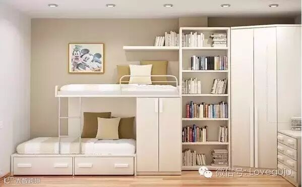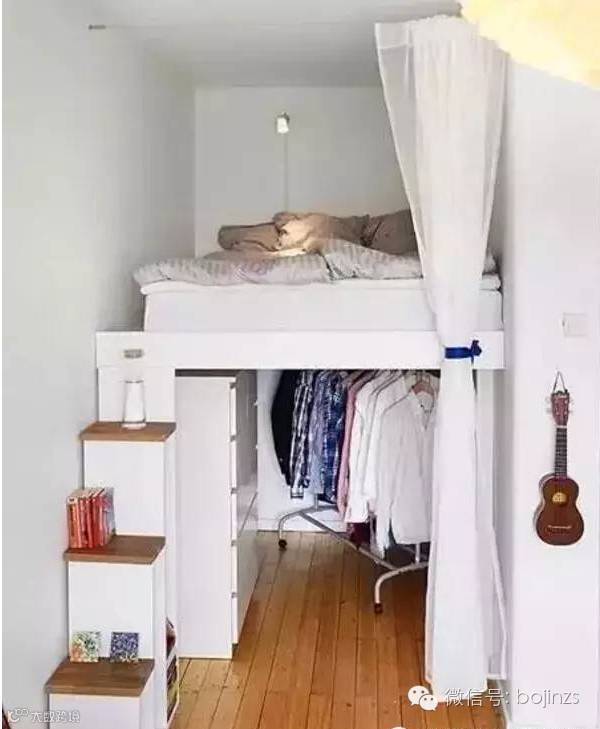 ▲家具的一物多用,是小空间最喜爱的事情。腾空床的适时加入,让小卧室有了更多可利用的地方。床的下端多出的空间正好可以用来放置沙发,不用时收起来能释放更多的卧室空间。