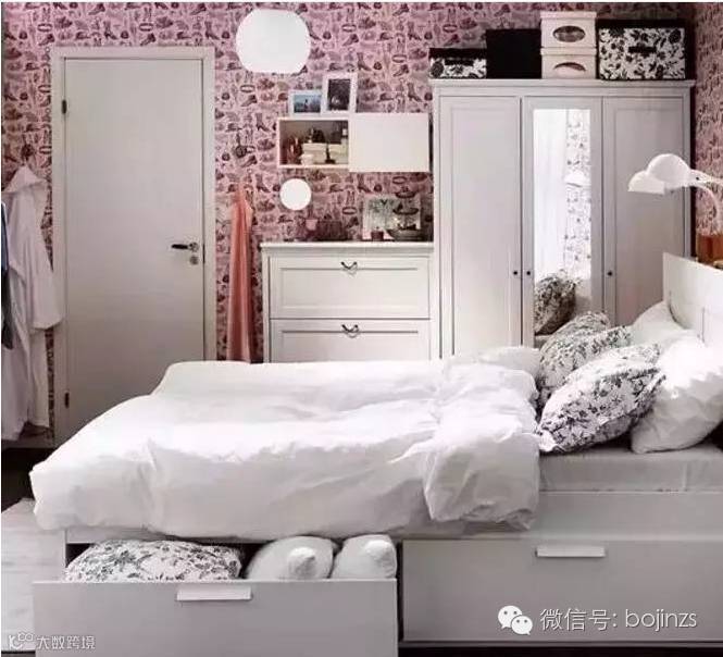 ▲床头都是一个柜子,上面还可以放书,床头柜和床下位置放上储物篮,干净又整洁。