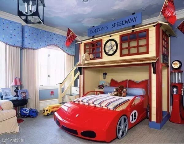 跑车造型打造出的床,与前一款有异曲同工之处,以修车厂元素作为儿童房主题,还特别搭建了二层小阁楼,可以让孩子在这里尽情玩耍。天花板则被刷成了天空色,抬头仰望,在自家天花板上就能看见蓝天白云,这样的儿童房相信孩子一定会喜欢。