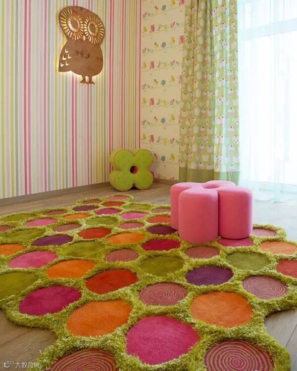 多色块的原点地毯,除了能够为孩子提供温暖的玩乐地外,还是跳跳游戏的好垫子。