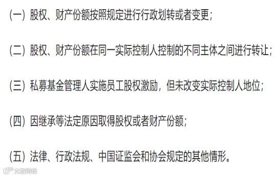 除此之外,新规中还规定:如果出现实际控制权变更,则提交变更之日前12个月的月均管理规模应持续不低于3000万元,并提供相应材料;私募基金管理人的实际控制人所持有的股权、财产份额或者实际控制权,自登记或者变更登记之日起3年内不得转让,但有下列情形之一的除外: