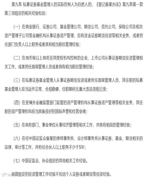 根据《办法》,私募证券基金管理人法定代表人、执行事务合伙人或其委派代表、经营管理主要负责人以及负责投资管理的高级管理人员应当具有5年以上证券、基金、期货投资管理等相关工作经验。