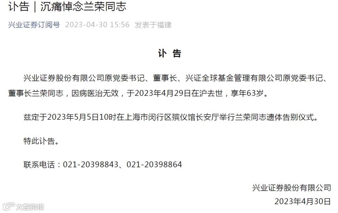 4月30日,兴业证券股份有限公司发布讣告,兴业证券原党委书记、董事长、兴证全球基金管理有限公司原党委书记、董事长兰荣同志,因病医治无效,于2023年4月29日在沪去世,享年63岁。