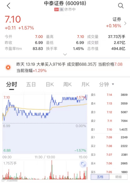 股价方面,截至4月14日收盘,中泰证券涨1.57%,报7.1元/股,总市值494.8亿元。