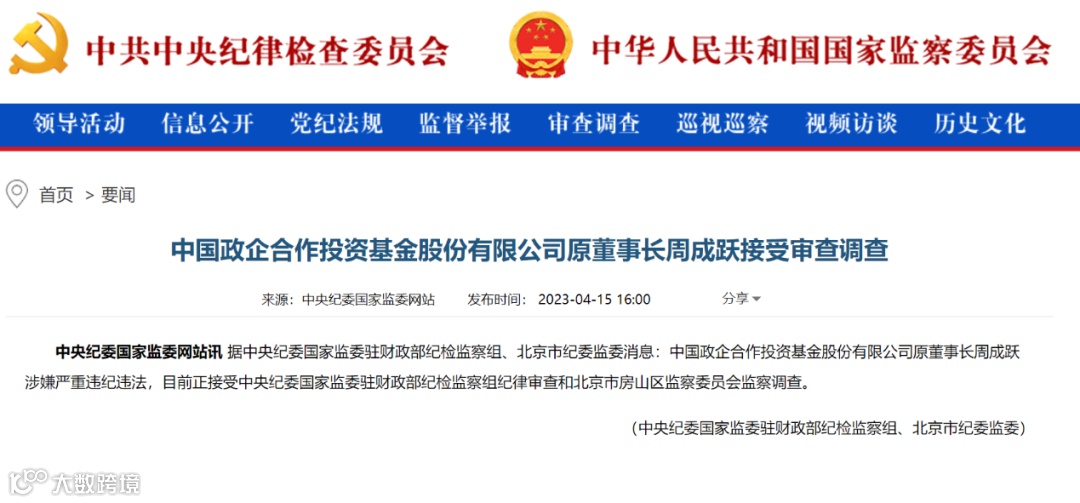 4月15日,据中央纪委国家监委驻财政部纪检监察组、北京市纪委监委消息:中国政企合作投资基金股份有限公司原董事长周成跃涉嫌严重违纪违法,目前正接受中央纪委国家监委驻财政部纪检监察组纪律审查和北京市房山区监察委员会监察调查。