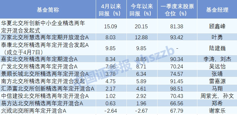 此外,万家北交所慧选两年定期开放混合A、嘉实北交所精选两年定期混合A、广发北交所精选两年定开混合A今年以来的涨幅均超过了8%。而成立于今年4月7日的泰康北交所精选两年定开混合发起A也迅速建仓,截至5月5日,该基金成立以来的收益率已达9.85%。