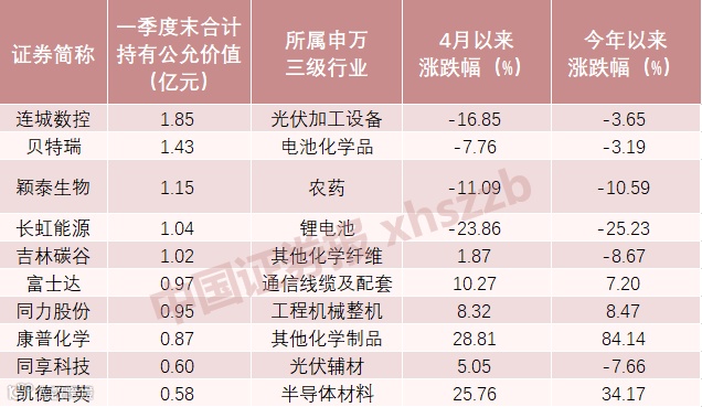 具体持仓方面,连城数控、贝特瑞、颖泰生物、长虹能源、吉林碳谷等为一季度末北交所主题基金整体持有公允价值较高的重仓股,合计持有价值均超过了1亿元。并且,今年以来涨势突出的曙光数创、康普化学、凯德石英等也被多只北交所主题基金重仓持有。