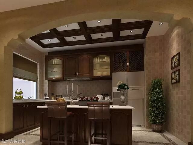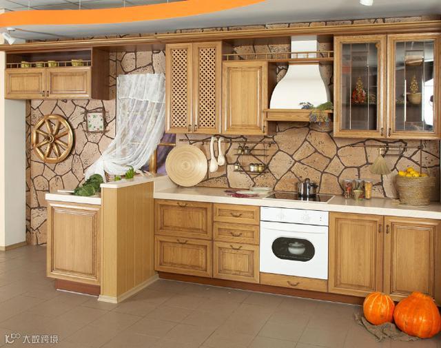 使用大块的石头墙面,这样更加具有原始和野性的风味,配搭上全木色的橱柜,美国田园风格呼之欲出。