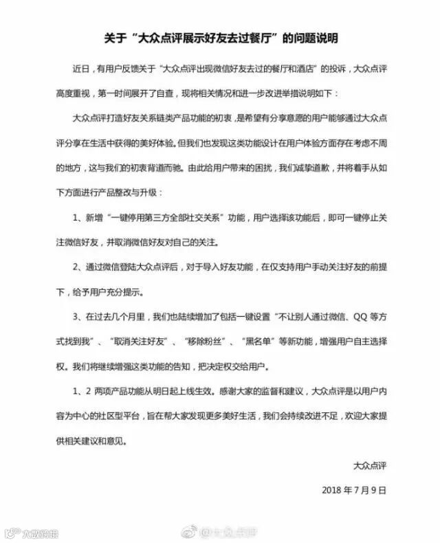 7月9日下午,大众点评通过官方微博发布问题说明