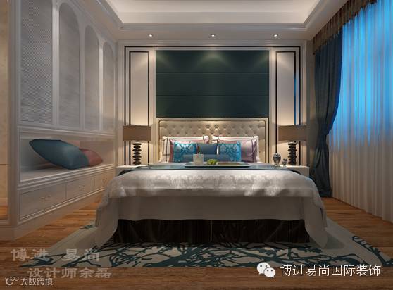 柔和灯光和颜色设计充分适合深度睡眠,美式简约讲究色彩和质感,且卧室主要是舒适为主,蓝色让人想起大海和蓝天。