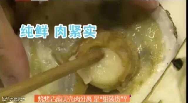 在烧烤店里,记者发现了一个奇怪的地方:有的地方的烤扇贝,可以轻易把贝肉夹起来,贝肉并没有和贝壳连在一起。而有的店的烤扇贝,则是肉和壳粘在一起的,不会轻松脱离。