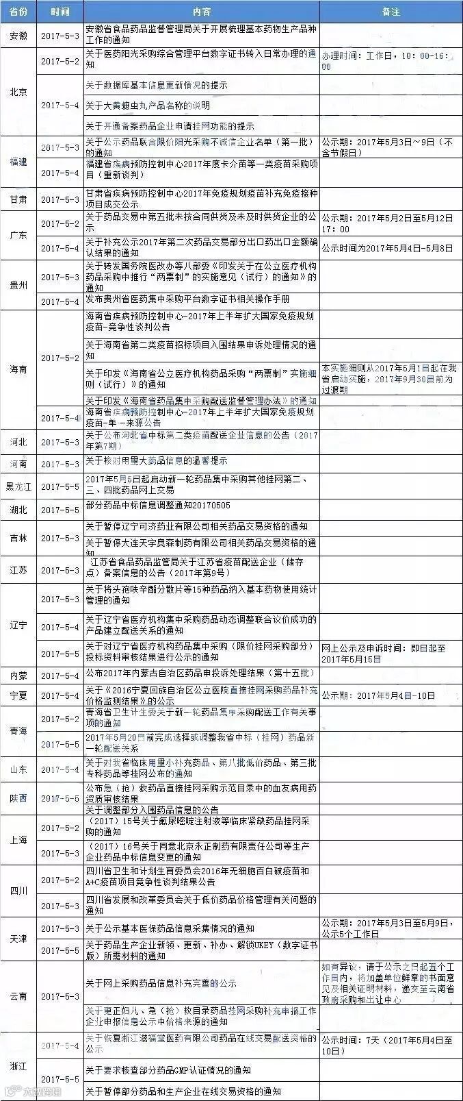 截止到2017-5-5日15:00,方案发布的情况是:正式版(23个省):福建、海南(基药)、广西、江苏、四川、内蒙古、甘肃、宁夏、山西、青海、黑龙江、辽宁、天津、江西、贵州、吉林、云南、湖北、山东、上海、广东、河南、西藏;征求意见稿(3个省):陕西、新疆、海南(非基药);