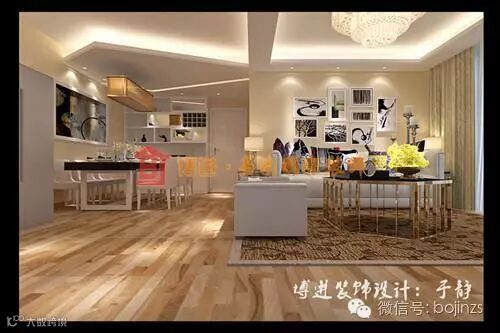 映入眼帘就两个造型新颖的分割吊顶。为了让开放性的客餐厅显出独立性,顶面位置在厨房和客厅做出了两个层次性的吊顶。设计师于静运用白色为底色,装饰使用了木黄、银黑色做点缀十分活力,空间既有愉快活泼的氛围,但却会显得太杂乱。舒静的照片墙、特殊的餐厅吊灯搭配的恰到好处。