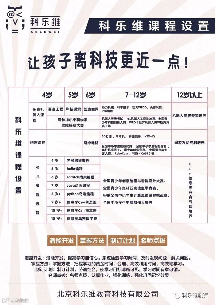 科乐维编程教育注重创新教育课程的开发与实施,长期与大中小学、职业院校及培训学校合作,设计开发个性化创新教育课程体系,具有专业的师资、设备、教材等。引进国外先进机器人设备,体验性强。同时在创客机器人方面起到创新引领的作用,校本课程应用于多所学校,相关工作得到教育部和北京市教委领导充分肯定及高度评价。