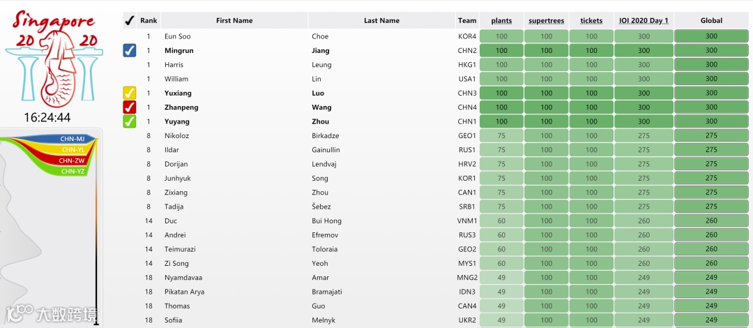 比赛结束后,共 7 名选手以满分成绩暂时并列第一,分别为中国国家队四名选手周雨扬(绍兴市第一中学)、罗煜翔(宁波市镇海中学)、蒋明润(成都市第七中学)、王展鹏(绍兴市第一中学)、来自中国香港队的 Harris Leung 、来自韩国的 Eun Soo Choe 和来自美国的 William Lin。