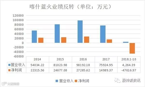 不过,业绩承诺期过后的2017年,喀什蓝火的业绩开始恶化,净利润暴降至1.50亿元,经营性现金流仅-5292.26万元。今年继续恶化,2018年前10月,喀什蓝火营业收入4264.39万元,同比下降90%以上,净利润巨亏4.76亿元。