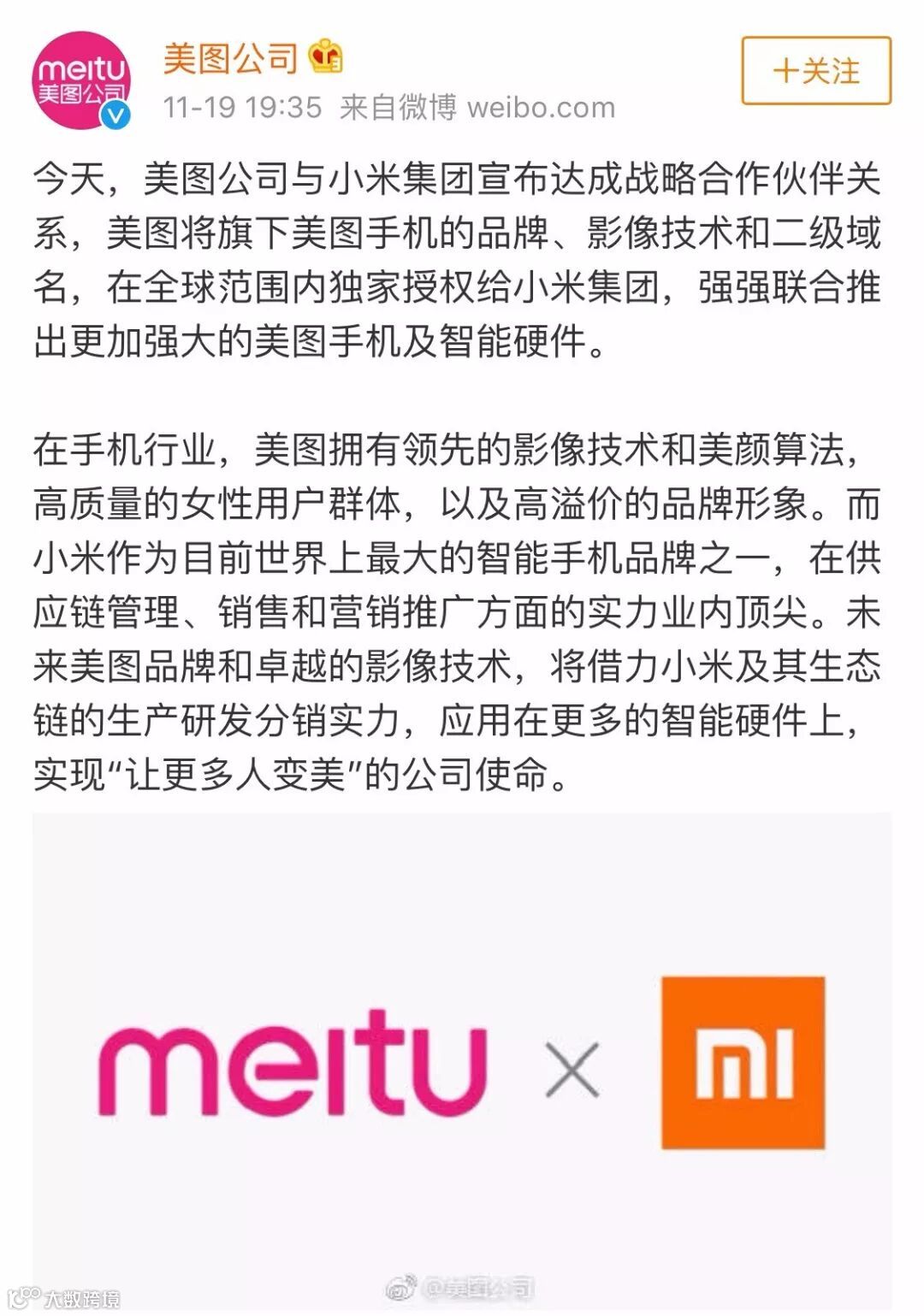在2018年第三季度财报中,小米宣布与美图签订战略合作协议,小米将获得美图手机品牌和相关影像技术,以及大部分智能硬件的30年全球独家授权。小米在财报电话会议上表示,和美图合作是为了拓宽女性用户群,开发针对女性的手机。