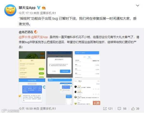 有微博网友称聊天宝出现bug,部分用户在摇钱树收一次金币可兑换上百万现金。对此,聊天宝官方微博称,“摇钱树”功能由于出现bug已暂时下线,将在修复后第一时间发出通知。