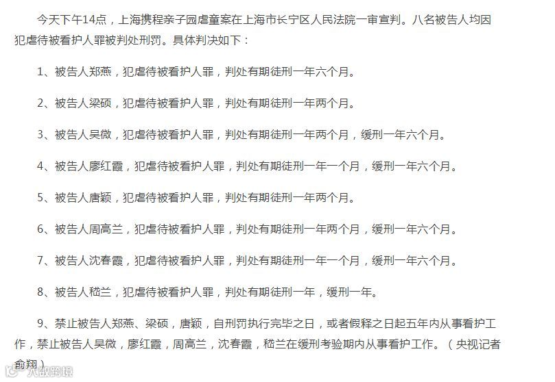 13.携程亲子园虐童案:8名被告人被判1年到1年半不等