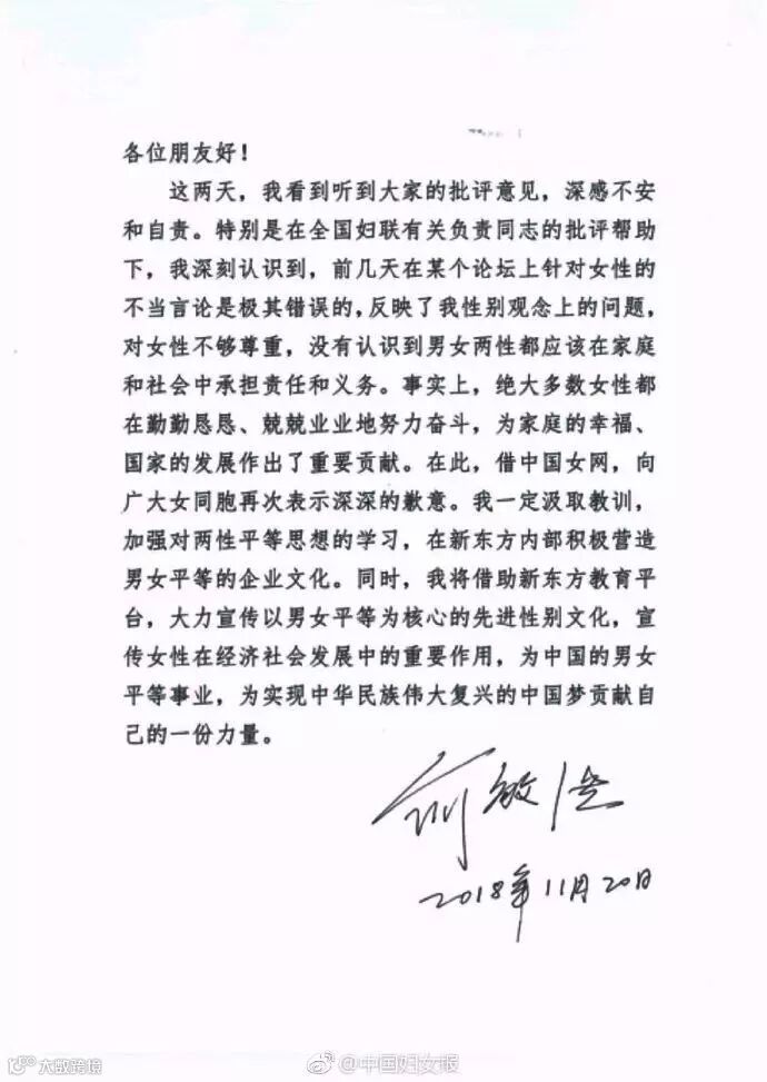 1.俞敏洪到全国妇联机关向广大女同胞诚恳道歉