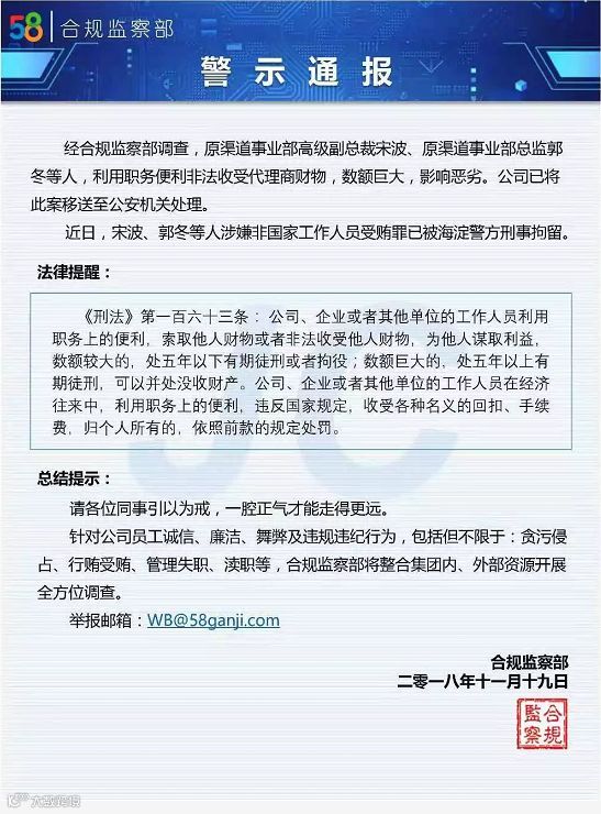 11月20日,58同城合规监察部近日发布内部通报称,原渠道事业部高级副总裁宋波、原渠道事业部总监郭冬等人,利用职务便利非法收受代理商财物,涉嫌非国家工作人员受贿罪已被海淀警方刑事拘留。58同城在内部通报中称,两人利用职务便利非法收受代理商财物,数额巨大,影响恶劣,公司已将此案移送至公安机关处理。(张俊)