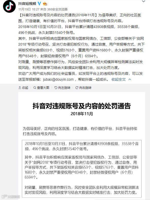 抖音近日公布了今年10月对违规账号及内容的处罚通告。通告显示,2018年10月1日至10月31日,抖音平台累计清理43908条视频,35538个音频,496个挑战,永久封禁51540个账号。