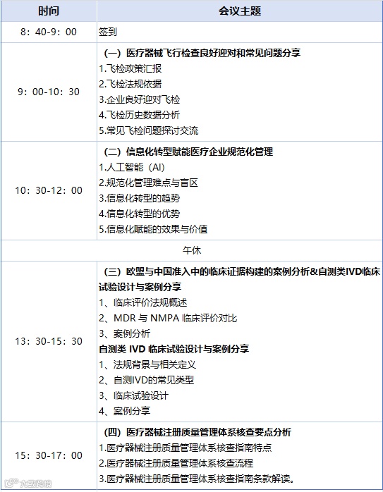 在医疗器械行业高速发展与法规政策持续革新的双重驱动下,加上当下大环境影响,企业正面临多重挑战。而企业在飞行检查中是否满足合规性、医疗器械注册质量管理体系 核查重点是否满足要求、医疗企业管理的信息化转型趋势、欧盟与中国准入中的临床证据 构建的案例分析等方面也都是存在盲区或痛点。为深入贯彻医疗器械行业高质量发展要求,助力企业精准把握法规动态、了解产品临床实验要点,提升合规能力与质量管理水平及其 接轨数字化趋势下的信息化转型,让企业保持合规性的前提下更加提升自身市场竞争力。