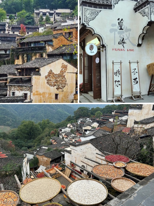 篁岭晒秋 ,民居围绕水口呈扇形梯状错落排布。篁岭"晒秋"闻名遐迩,村落、天街九巷似玉带将经典古建筑串接,徽式商铺林立,前店后坊,一幅流动的缩写版"清明上河图"。
