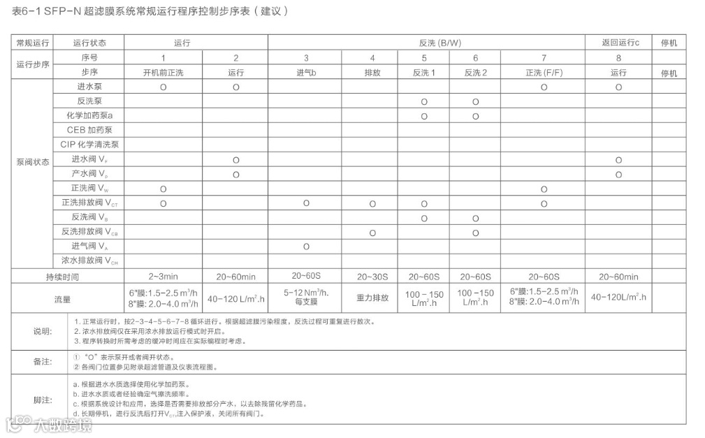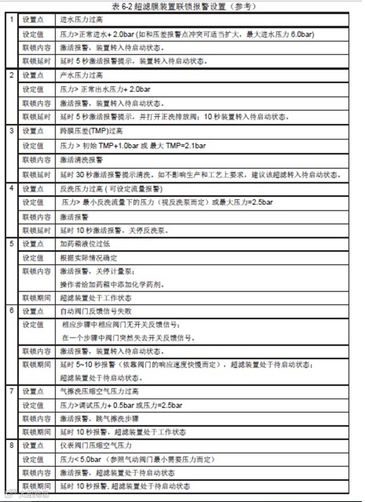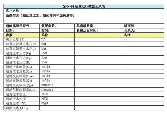 所有与系统有关的资料都必须收集、记录和建档以便追踪超滤单元装置的性能。除了用于追溯系统性能之外,运行数据记录表还是及时发现并排除故障的有效工具之一,也根据保证条款下申请质保的依据之一。本节仅作为一般的指导,不能作为取代具体系统应有的详细操作和维护手册,现场操作参数的记录和保存还需视当时情况而定。