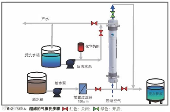 超滤膜系统按照自动控制程序将转入气擦洗步骤,气擦洗是利用压缩空气产生的气泡松动膜丝外表面截留的污染物。压缩空气从膜组件底部进气口进入到膜丝外表面,从顶部浓水口排出。