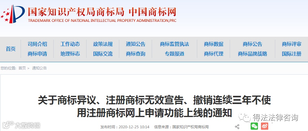 商标局发布关于商标异议、注册商标无效宣告、撤销连续三年不使用注册商标网上申请功能上线的通知