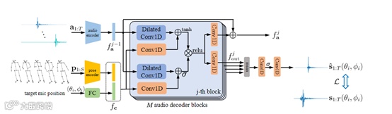 同时, 每个解码块都包含卷积层、门控层和残差连接,可以捕获音频的长时序上下文。同时,解码块通过条件输入,结合音频特征、姿态特征和目标位置编码,来生成三维目标位置的音频输出。