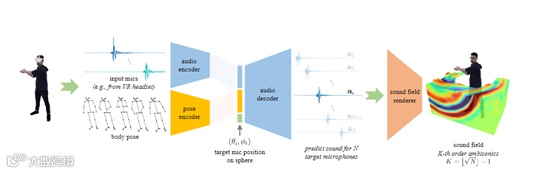 据悉该模型使用了头戴式麦克风的音频信号以及人体姿态作为输入,输出包围发声人身体的三维音场,从而可以在三维空间的任意位置渲染出空间音频。