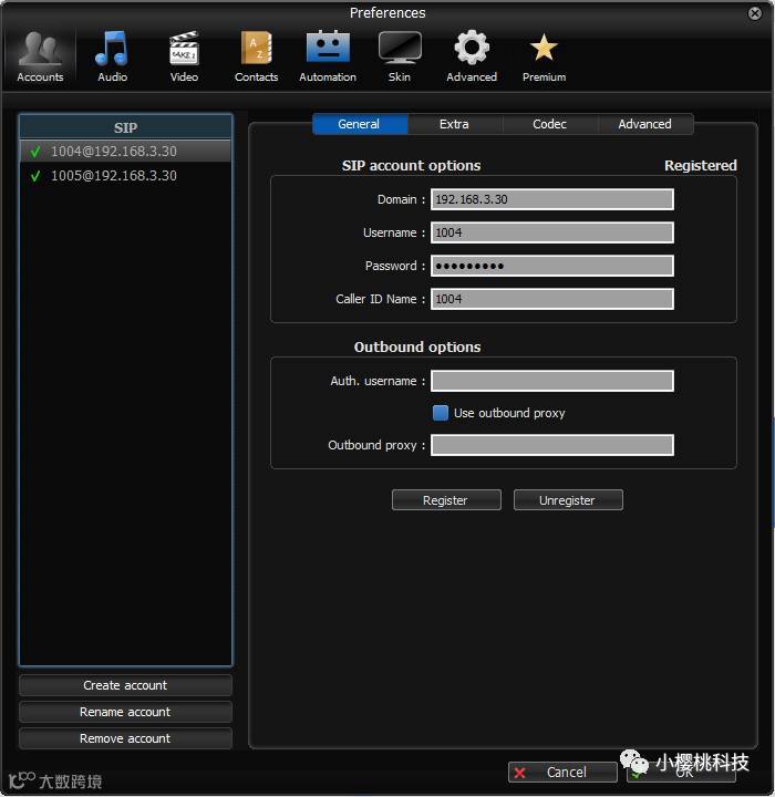 左下角显示状态,在setting中可查看debuglog。创建账号:点击“Yate”→选择“add account”或者“addaccount wizard”;Add account 选择协议,输入注册号码、注册密码以及服务器。