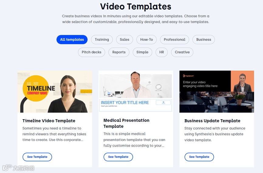 为了帮助用户快速生成视频简化制作流程,Synthesia提供了60多个真人视频模版,涵盖医疗、销售、商业、演讲、报告等多个业务场景。