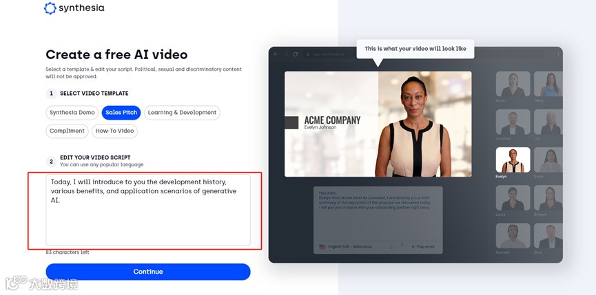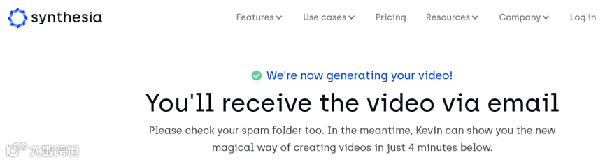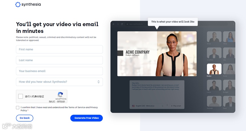 2)点击Continue按钮。填写你的姓名、邮箱地址,然后点击免费生成视频按钮。Synthesia会将生成的视频直接发送到你的邮箱中。