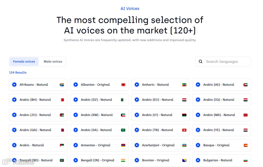 Synthesia支持文本转音频功能,提供了120多种语言,包括中文、英文、日文、德文、法文、韩文等,几乎涵盖全球所有主流语言。用户也可以直接使用自己的声音,应用在视频中。