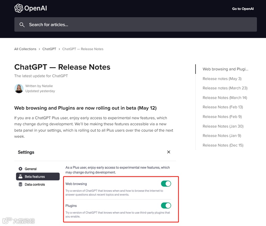 5月13日,OpenAI在官网宣布,下周,所有ChatGPT Plus用户可以在新的测试选项中获得联网(Web browsing)和插件(Plugins)功能。