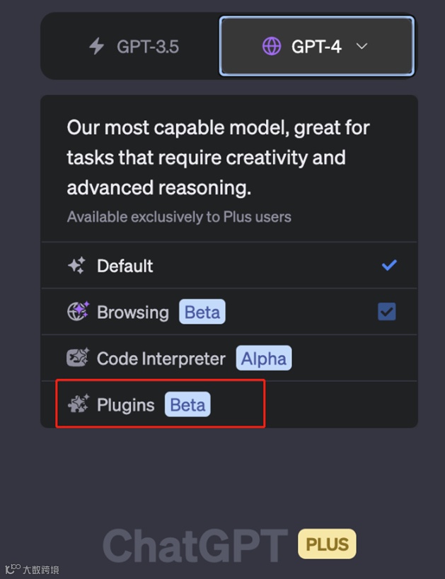 用户使用插件流程也非常简单,ChatGPT Plus用户获取插件功能后,点击Plugins按钮。