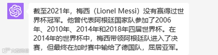 1,单机模式的ChatGPT,功能局限性太大:目前,大家使用的ChatGPT是单机版并且训练数据是截至2021年的,例如,你问ChatGPT梅西得过世界杯冠军吗?