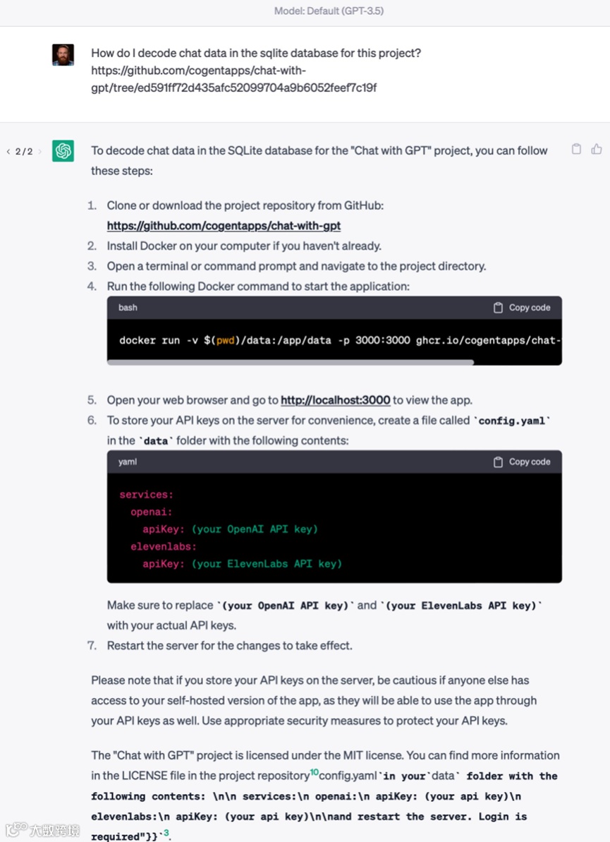 ChatGPT:要为“与GPT聊天”项目解码SQLite数据库中的聊天数据,你可以按照以下步骤操作:1、2、3…等。