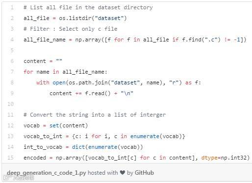 做任何监督学习都需要一个训练数据集,我们这个网络也一样。项目的代码全部基于 C 语言(用太简单的语言就没意思了)。因此,我们的训练数据集将是 Github Linux 库里的 C 语言脚本。我已经预先提取了相关的 .c 代码。