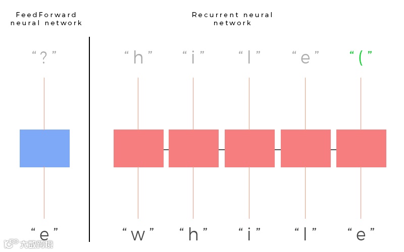 为了说明最后一个例子,一个经典的分类器(上图的左边)接收前面的字母;这个字母会被传入隐藏层(用蓝色表示),网络会推导出一个输出。一个循环的神经网络在结构上是不同的。每个单元(用红色表示)不仅连接到输入,还与时刻 t-1 的单元相连。为了解决我们的问题,我们将使用 LSTM(长短时内存)单元。