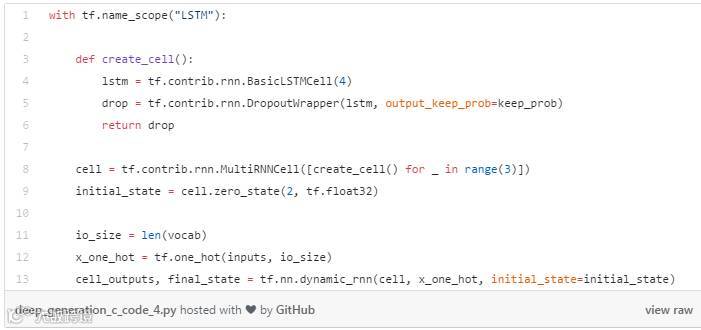 create_cell() 用于创建一个 LSTM 单元,这个 LSTM 单元由 4 个隐藏神经元组成。这个函数会在将结果返回给我们前,在输出上添加一个 dropout。
