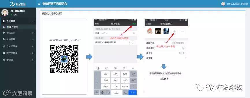 您可以通过朋友推荐先加机器人好友,也可以在注册登陆后台后点击系统管理页面,扫描二维码领养属于你的机器人。
