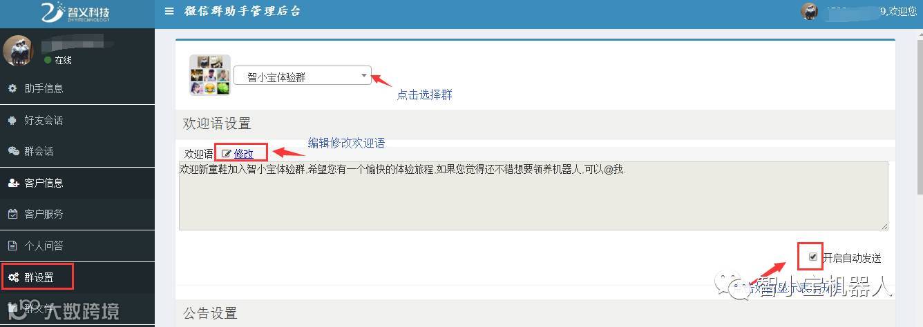 群设置:新人入群欢迎语,登录智小宝后台,选择您想要设置欢迎语的群,自定义个性欢迎语。
