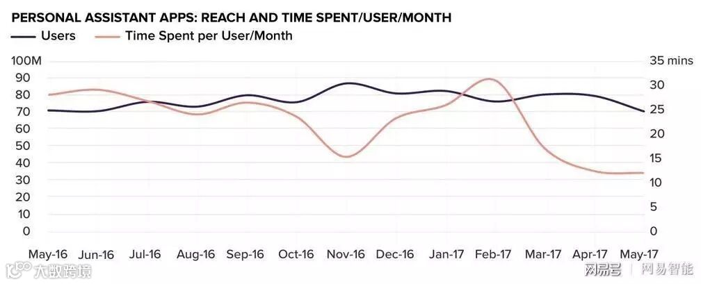 图表:美国个人助理应用的用户数量以及使用时间
