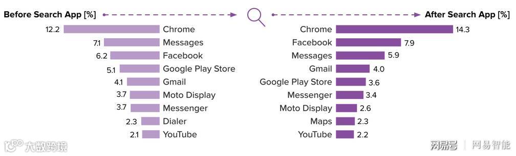 基于个人助理应用经常用于搜索信息的假设,我们还进行了第二个漏斗分析来对比,我们分析了用户在使用搜索应用或搜索网站之前和之后使用的应用程序。