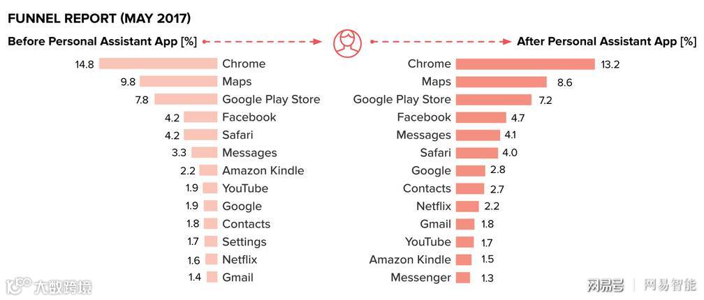 对个人助理应用的漏斗分析显示,在使用个人助理应用之前和之后,谷歌应用程序占据了消费者活动的主导地位:Chrome浏览器、谷歌地图和Google Play商店是在漏斗两端使用的三个主要应用程序。