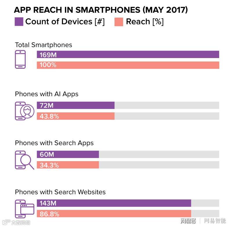 Verto Analytics的数据显示,在2017年5月份,美国有44%的智能手机(这些手机用户为18岁以上成年人)安装有一款在该区间内至少被使用了一次的个人助理应用。虽然这一数据要大于搜索类应用程序(诸如维基百科,Yelp或是谷歌搜索)的数据,(搜索类程序的数据位37%),但它仍然远远落后于基于网站搜索的数据,即87%的手机拥有一款网页浏览器,并在这一时段内使用浏览器登陆了搜索引擎网站。